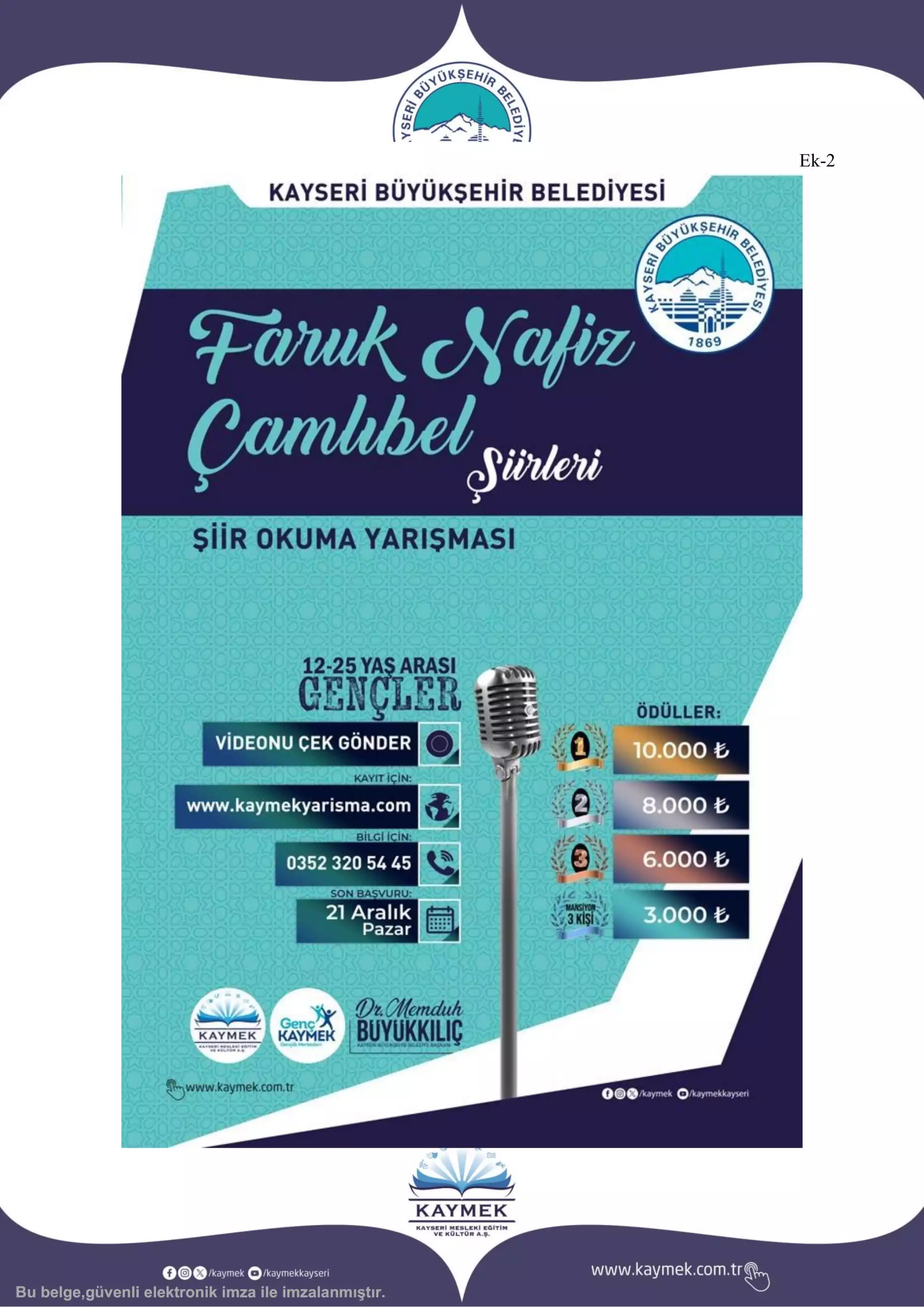 Kayseri Büyükşehir Belediyesi bünyesinde faaliyetlerini yürüten KAYMEK tarafından "Faruk Nafiz ÇAMLIBEL Şiirleri Ödüllü Şiir Okuma Yarışması" düzenlenecektir. İlgilenen öğrencilerimize duyurulur.