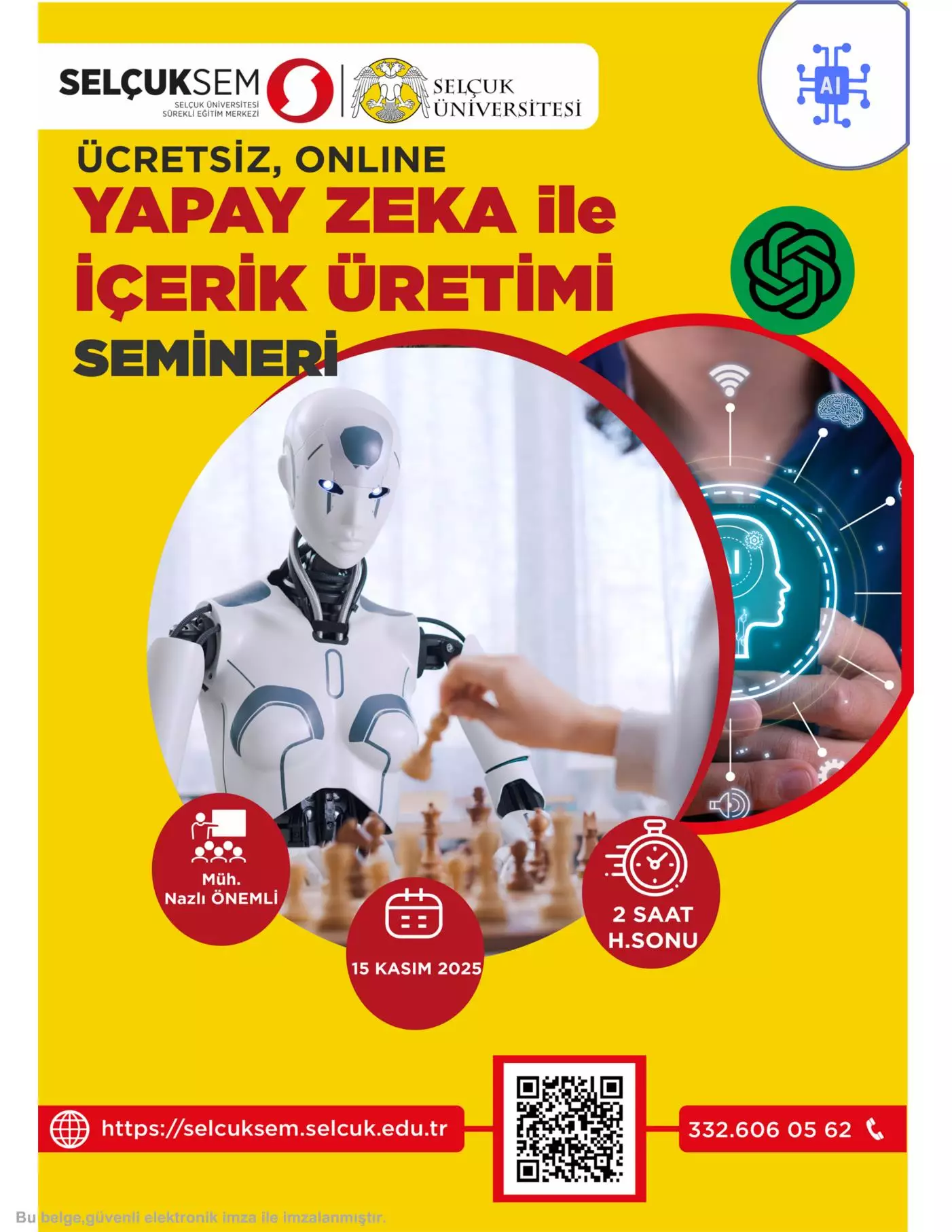 Selçuk Üniversitesi Sürekli Eğitim Uygulama ve Araştırma Merkezi Müdürlüğü tarafından 15 Kasım 2025 Cumartesi günü saat 13:00-15:00 saatleri arasında ücretsiz ve çevrim içi olarak "Yapay Zekâ ile İçerik Üretimi" semineri düzenlenecektir.